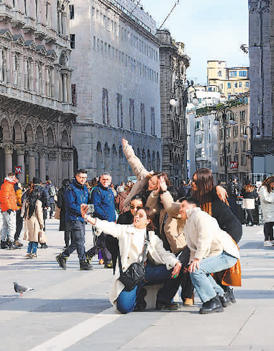 意大利米蘭市中心,中外游客在景點(diǎn)前擺造型拍合影。