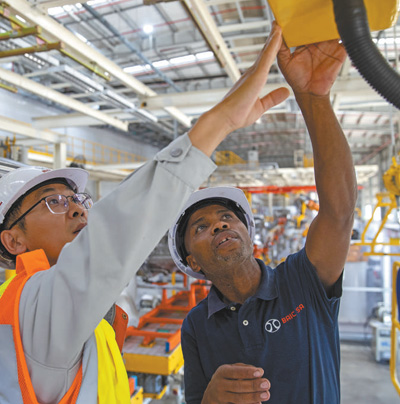 中國和南非兩國員工在南非東開普省北汽南非工廠焊裝車間內(nèi)工作。