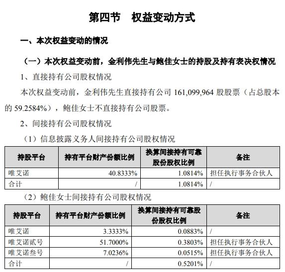 公告顯示,金利偉和鮑佳持有的唯艾諾、唯艾諾貳號(hào)、唯艾諾叁號(hào)三家合伙企業(yè)的財(cái)產(chǎn)份額由雙方均等分割,各占一半。唯艾諾貳號(hào)、唯艾諾叁號(hào)的執(zhí)行事務(wù)合伙人將變更為金利偉。變更后,三家合伙企業(yè)的執(zhí)行事務(wù)合伙人均為金利偉。