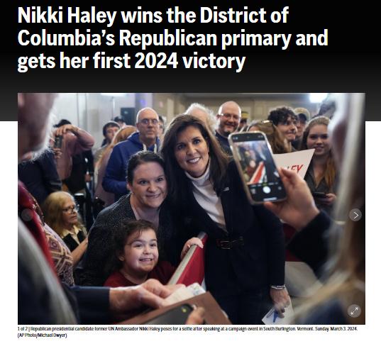 據(jù)美聯(lián)社報道,當(dāng)?shù)貢r間3日晚,華盛頓特區(qū)共和黨官員公布結(jié)果,黑利獲勝,贏得該區(qū)域所有19張代表票。