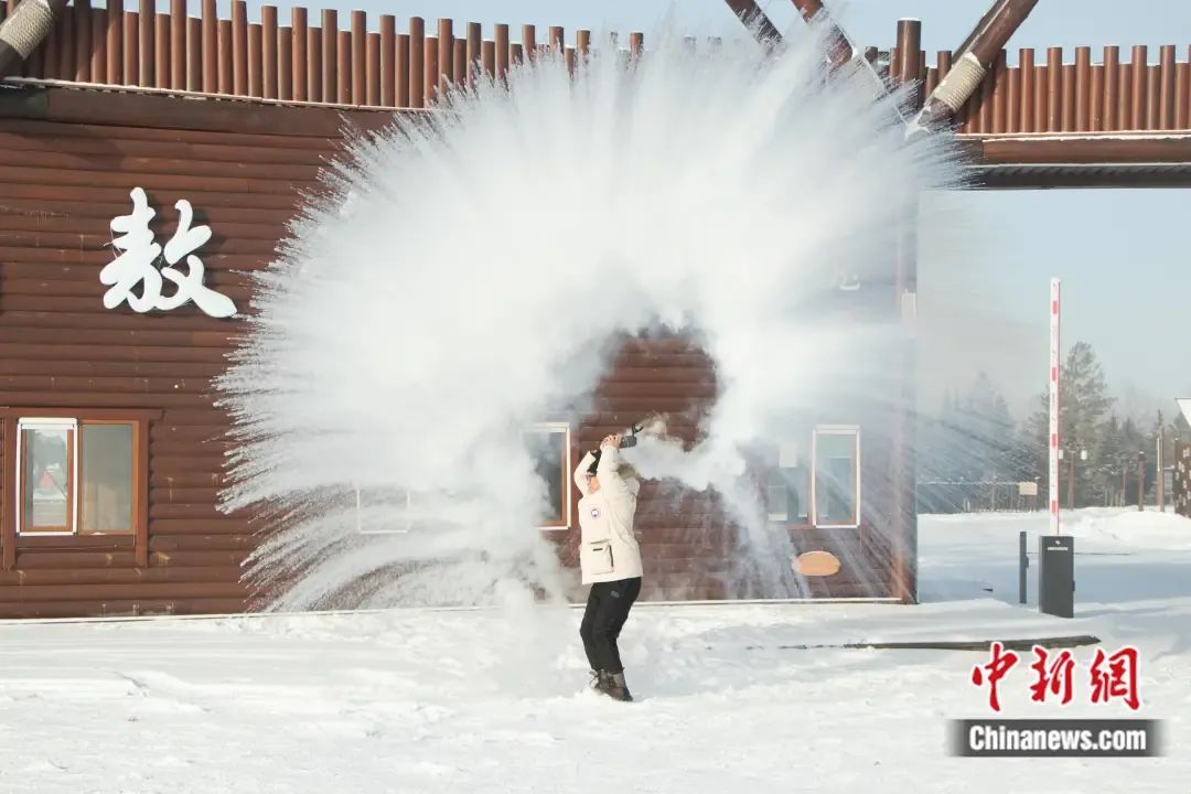 游客在極寒天氣中體驗(yàn)潑水成冰的快樂。 根河市委宣傳部供圖