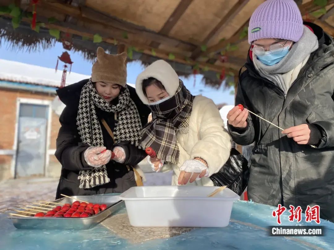 游客在冷極村體驗(yàn)手作糖葫蘆。 張瑋 攝