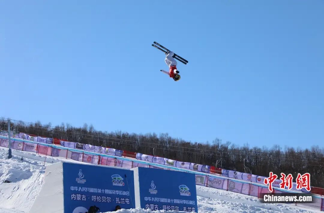 “十四冬 ”自由式滑雪空中技巧公開組女子個(gè)人比賽中,徐夢桃在空中翻飛。 韓冷 攝