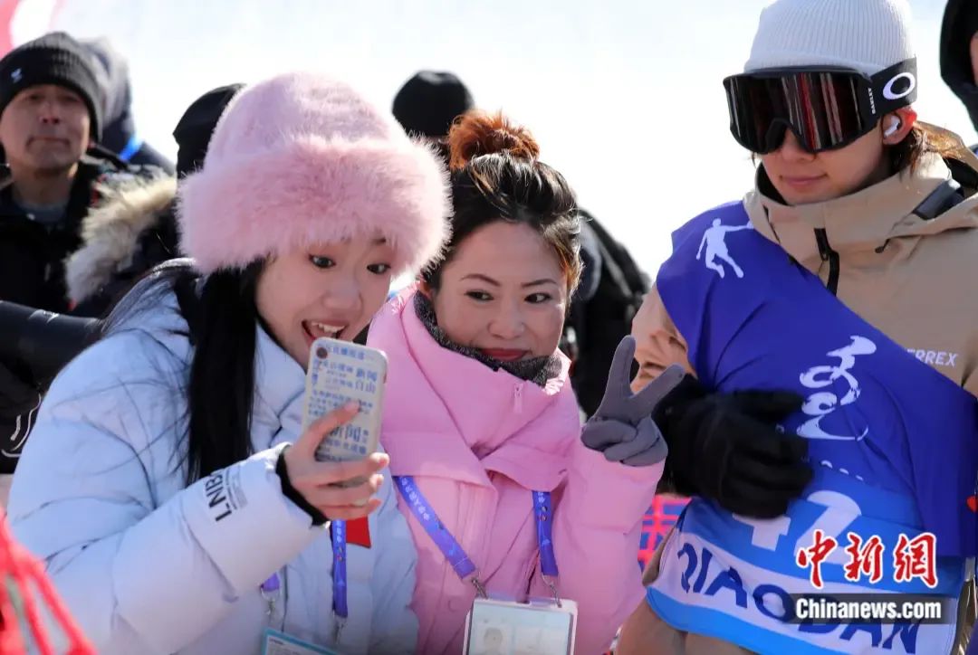 “十四冬”單板滑雪大跳臺公開組男子決賽現(xiàn)場,觀眾找比完賽的蘇翊鳴(右一)合影。 韓冷 攝
