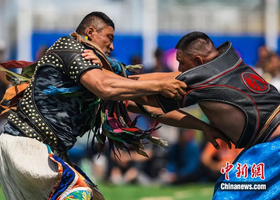 鄂溫克草原上的蒙古族那達(dá)慕上演傳統(tǒng)“男兒三藝”——搏克比賽。 呼木吉樂 攝