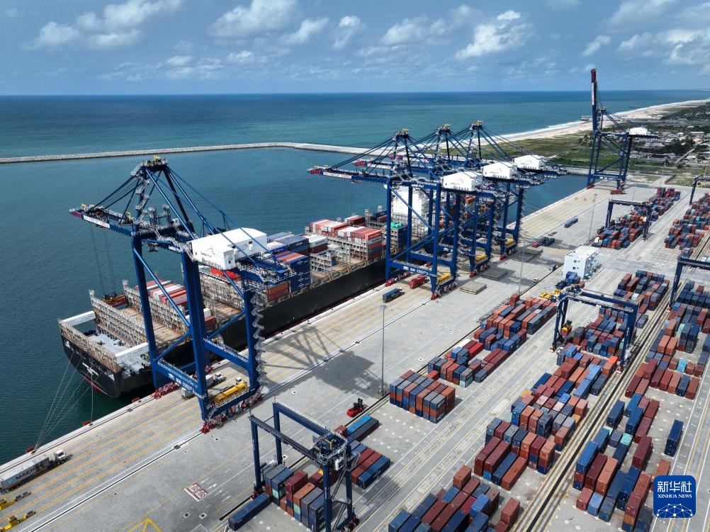 3月11日,一艘貨輪在尼日利亞拉各斯萊基深水港裝卸集裝箱(無(wú)人機(jī)照片)。新華社發(fā)(萊基港公司供圖)