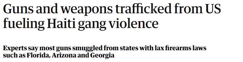 報道稱,當地街頭幫派成員手持高性能步槍、泵動式霰彈槍或自動武器的場景隨處可見,但海地并沒有能力生產這些高性能武器。專家表示,這些武器主要從美國流入,大多數槍支來自佛羅里達州、亞利桑那州、得克薩斯州等美國槍支管控法律寬松的地區(qū)。
