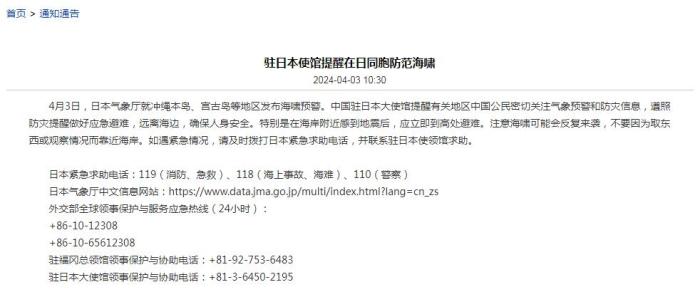 中新網(wǎng)4月3日電 據(jù)中國駐日本大使館官網(wǎng)消息,4月3日,日本氣象廳就沖繩本島、宮古島等地區(qū)發(fā)布海嘯預(yù)警。中國駐日本大使館提醒有關(guān)地區(qū)中國公民密切關(guān)注氣象預(yù)警和防災(zāi)信息,遵照防災(zāi)提醒做好應(yīng)急避難,遠(yuǎn)離海邊,確保人身安全。特別是在海岸附近感到地震后,應(yīng)立即到高處避難。注意海嘯可能會(huì)反復(fù)來襲,不要因?yàn)槿|西或觀察情況而靠近海岸。如遇緊急情況,請及時(shí)撥打日本緊急求助電話,并聯(lián)系駐日本使領(lǐng)館求助。