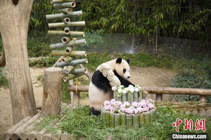 2023年7月20日,旅韓大熊貓“福寶”迎來三周歲生日。三星愛寶樂園為“福寶”舉行生日會慶生。圖為“福寶”和它的竹子“蛋糕”。 中新網(wǎng)記者 劉旭 攝