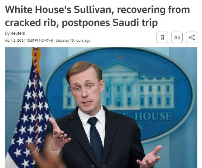 中新網(wǎng)4月4日電 據(jù)路透社報道,白宮當?shù)貢r間3日表示,美國總統(tǒng)國家安全事務助理沙利文肋骨骨折,目前正在康復,其原定本周前往沙特阿拉伯的計劃因此被推遲。