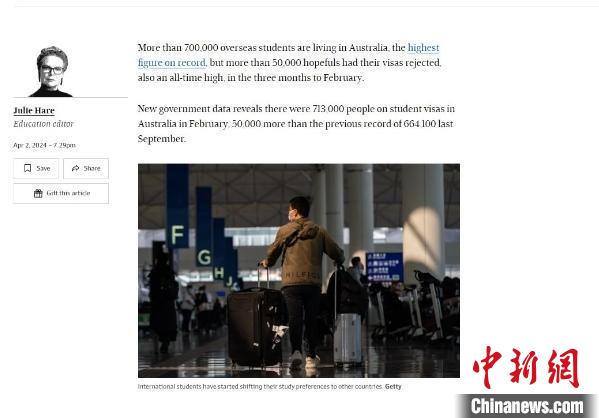 澳大利亞政府最新數(shù)據(jù)顯示,截至今年2月的三個月內,有超過5萬名申請簽證的留學生被拒。圖片來源于《澳大利亞金融評論》網(wǎng)站截圖。