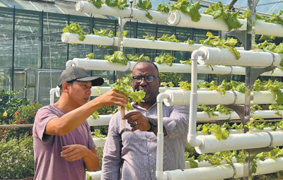 中國(guó)援多米尼克農(nóng)業(yè)技術(shù)合作項(xiàng)目始于2005年,目前已開展至第八期。項(xiàng)目引進(jìn)了多個(gè)高附加值農(nóng)作物品種,促進(jìn)了多米尼克農(nóng)業(yè)產(chǎn)業(yè)升級(jí)。圖為中多兩國(guó)農(nóng)業(yè)專家在觀察水培系統(tǒng)種苗生長(zhǎng)情況。