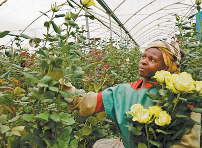 近年來,鮮花是肯尼亞出口中國(guó)的主要農(nóng)產(chǎn)品之一。圖為在肯尼亞奈瓦沙湖畔的一家鮮花農(nóng)場(chǎng),一名花農(nóng)正在采摘鮮花。