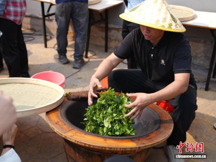 圖為炒茶師傅指導(dǎo)游客體驗(yàn)手工炒茶。嚴(yán)敏玉 攝