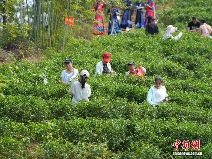 圖為游客們上山采摘春茶。嚴(yán)敏玉 攝