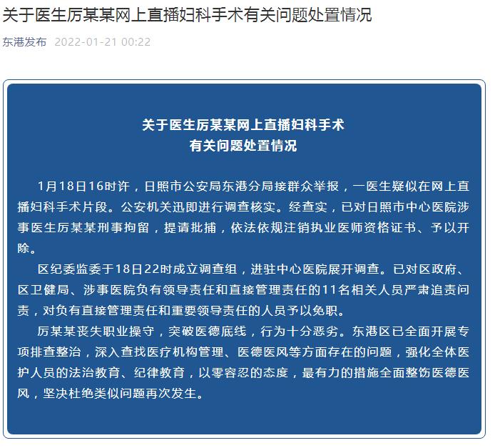人民網(wǎng)日照1月21日電(聶俊穹)1月21日,山東省日照市東港區(qū)委宣傳部發(fā)布通報(bào)稱:1月18日16時(shí)許,日照市公安局東港分局接群眾舉報(bào),一醫(yī)生疑似在網(wǎng)上直播婦科手術(shù)片段。日照市公安機(jī)關(guān)迅即進(jìn)行調(diào)查核實(shí)。經(jīng)查實(shí),已對(duì)日照市中心醫(yī)院涉事醫(yī)生厲某某刑事拘留,提請(qǐng)批捕,依法依規(guī)注銷執(zhí)業(yè)醫(yī)師資格證書、予以開除。