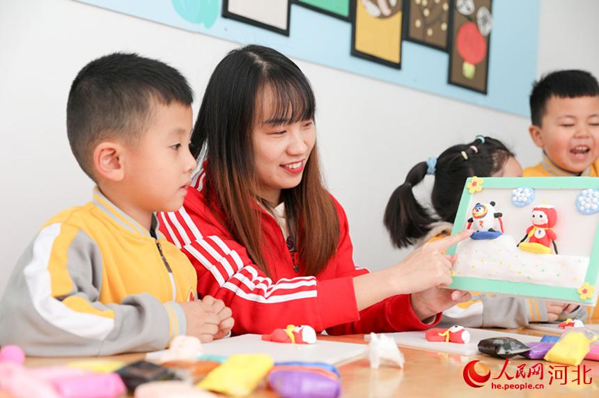 河北省邢臺(tái)市臨城縣縣直幼兒園孩子們?cè)诶蠋熤笇?dǎo)下,創(chuàng)作“迎冬奧”主題的手工作品。 劉一鳴攝