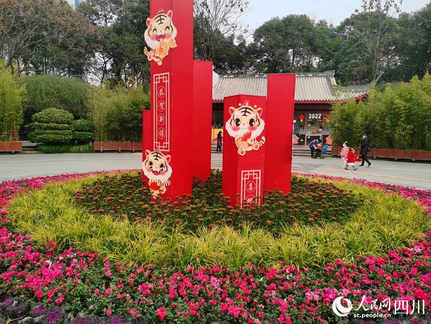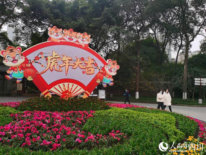 園內(nèi)的幾處空地上,布置了幾個(gè)花壇。上邊除了吉祥的紅黃色彩,還有可愛(ài)的動(dòng)漫形象老虎圖案?!盎⒛昙椤薄敖鸹⒂骸薄靶履昕鞓?lè)過(guò)年好”……各種好彩頭的詞語(yǔ),標(biāo)示出歡度春節(jié)的主題,看了讓人精神為之一振。