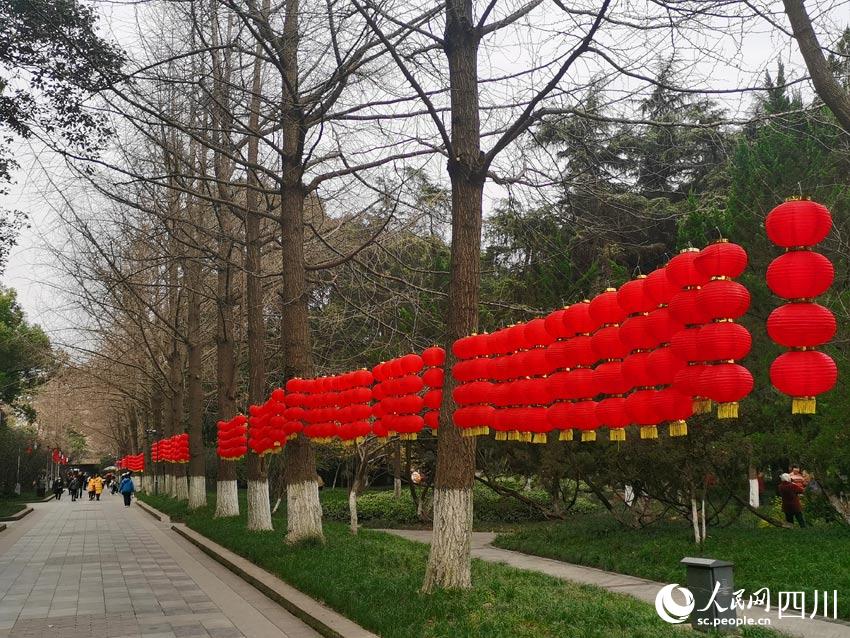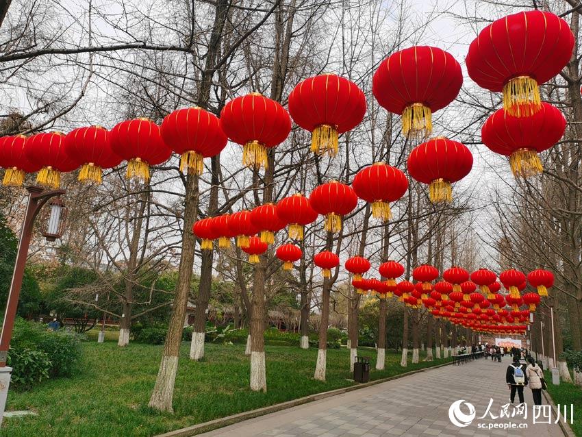 公園的大門(mén)布置成了喜慶的大紅色,門(mén)上門(mén)旁?huà)鞚M(mǎn)了紅燈籠。一串四個(gè)紅燈,既可以理解為“四季平安”,也可以理解為“四季發(fā)財(cái)”,還可以理解成“四平八穩(wěn)”……中國(guó)文化的詩(shī)意內(nèi)涵,可以激發(fā)出人們更多的想象力。
