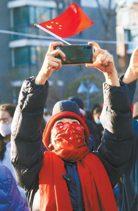 昨天,“重啟”的百旺茉莉園一期充滿了新年的喜慶,在小區(qū)南門廣場處,孩子們和居民們一起高唱《歌唱祖國》《明天會更好》,表達(dá)感激和喜悅之情。本報記者 王海欣攝
