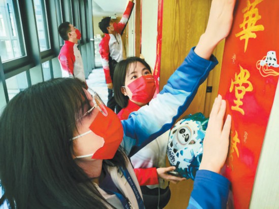 服務(wù)保障人員的村內(nèi)生活也趣味十足。下午3點(diǎn)多,一場“守海陀歲·延慶冬奧村新村民共贏未來”主題活動在訪客中心舉行?!拔⑿Φ难瑸榇蟮亻_花;愛灑向手心,純潔無瑕……”中外志愿者們用12種語言唱起北京冬奧會志愿者之歌《燃燒的雪花》,擊鼓傳花,匿名交換明信片,現(xiàn)場溫馨又熱鬧。而在媒體中心,志愿者寫福字,貼福字,迎接春節(jié)和冬奧的到來。晚上6點(diǎn)多,延慶冬奧村還迎來了“志愿者虎年春節(jié)聯(lián)歡晚會”,志愿者各顯身手帶來彈唱、傳統(tǒng)曲藝、芭蕾舞表演等節(jié)目,以“線上村晚”開啟新的一年。