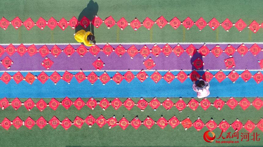 1月17日,河北省唐山市豐潤(rùn)區(qū)泉河頭鎮(zhèn)羅文口小學(xué)學(xué)生在晾曬為村民書(shū)寫的“?!弊?。 朱大勇攝