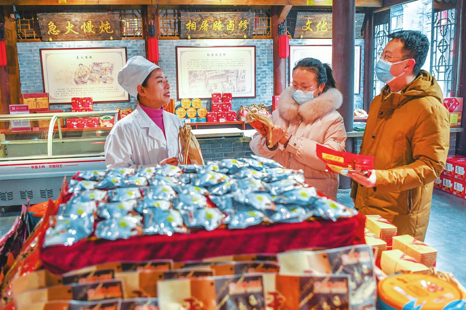 1月28日,游客在平遙古城一商店內(nèi)購買年貨?;⒛甏汗?jié)將至,平遙古城內(nèi)花燈高掛,特色產(chǎn)品商店貨物充足,洋溢著濃濃的年味。(梁生仁攝)