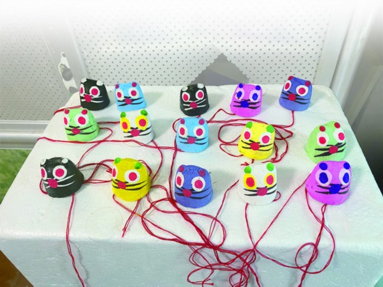 記者看到,吳為民的老伴王培珍拎起兩只系著紅繩的“皮老虎”,熟練地倒置在顏料桶中,等到其身體全部浸沒(méi),立刻拿出,迅速掛在旁邊細(xì)長(zhǎng)的竹竿上,三四天之后,方能上畫(huà)。只見(jiàn)王培珍在模型上用自制毛筆畫(huà)了起來(lái),不一會(huì)兒,“皮老虎”胡須就出來(lái)了,最后用紅、白顏料分別點(diǎn)出“皮老虎”的眼白、眼珠和耳朵,一只活靈活現(xiàn)的老虎就畫(huà)成了。