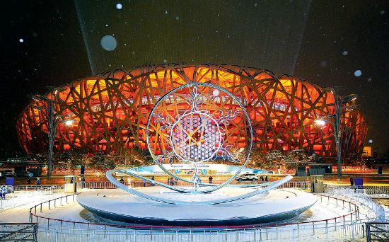 雪夜,北京賽區(qū)頒獎(jiǎng)廣場(chǎng)“雪花”火炬展示臺(tái)與鳥(niǎo)巢交相輝映。 本報(bào)記者 方非攝