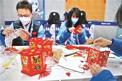 昨天是中國的傳統(tǒng)節(jié)日元宵佳節(jié),國家體育館開展了豐富多彩的慶祝活動,當(dāng)天場館餐廳提供了湯圓,場館禮賓部工作人員向外賓介紹中國吃湯圓的由來和寓意,并邀請大家品嘗。在志愿者之家內(nèi),彩燈高懸,充滿歡聲笑語,志愿者們做燈籠、猜燈謎,共同度過一個歡樂祥和的元宵節(jié)。圖為冬奧志愿者在制作花燈。文并攝/本報記者 黑建軍