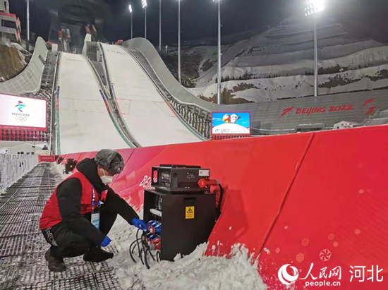 國家跳臺滑雪中心電力保障團隊在賽事后檢查用電設(shè)備。 韓寶喜攝