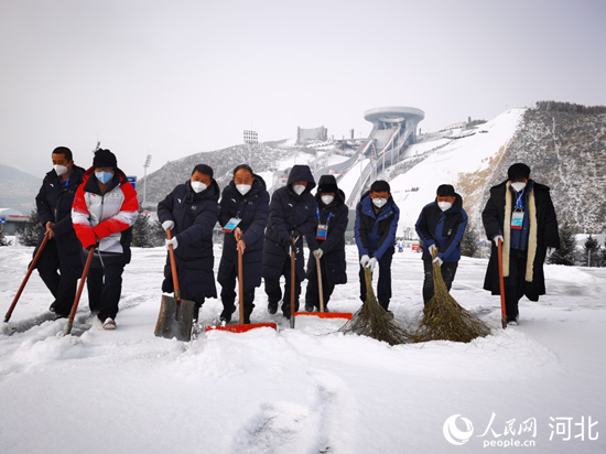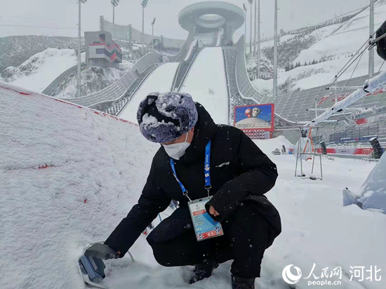 國家冬季兩項電力保障團隊在暴雪中清理積雪,確保設(shè)備健康。 馬錚攝