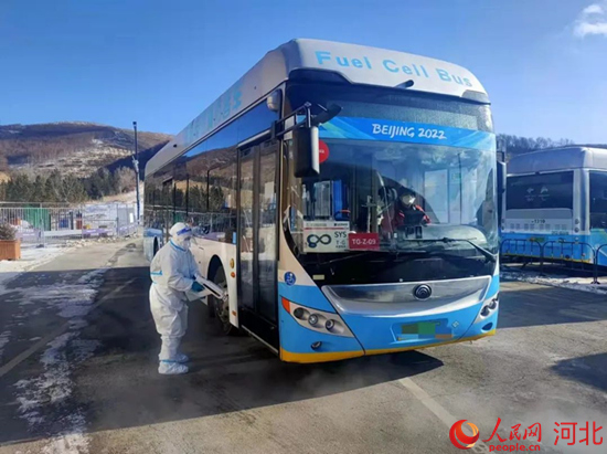張家口賽區(qū)運(yùn)行保障團(tuán)隊(duì)工作人員在對(duì)車(chē)輛進(jìn)行消毒工作。 譚磊攝