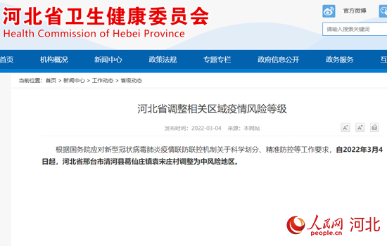 人民網石家莊3月4日電 據(jù)河北省衛(wèi)健委發(fā)布的最新消息,根據(jù)國務院應對新型冠狀病毒肺炎疫情聯(lián)防聯(lián)控機制關于科學劃分、精準防控等工作要求,自2022年3月4日起,河北省將邢臺市清河縣葛仙莊鎮(zhèn)袁宋莊村調整為中風險地區(qū)。