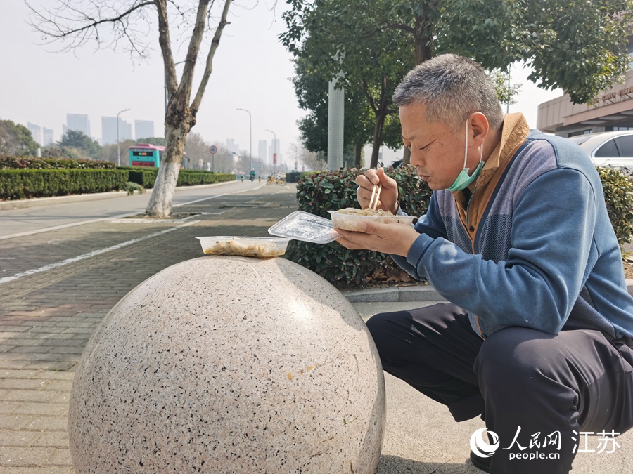 3月2日,忙完志愿服務(wù)工作后,王新買了一份快餐。由于禁止堂食,他蹲在路邊吃了起來(lái)。人民網(wǎng)記者 王繼亮攝