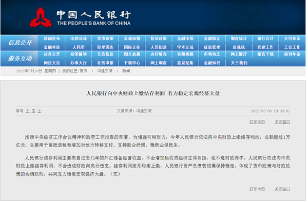 人民網(wǎng)北京3月10日電 (黃盛)日前,中國人民銀行(以下簡稱“人民銀行”)發(fā)布公告表示,按照中央經(jīng)濟工作會議精神和政府工作報告的部署,為增強可用財力,央行依法向中央財政上繳結(jié)存利潤,總額超過1萬億元。