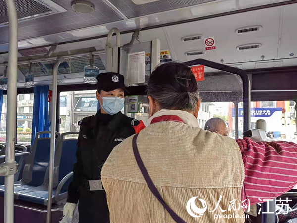 守護(hù)公交防疫安全的乘務(wù)巡檢員黃平(左)。江融宣攝