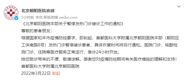 北京朝陽(yáng)醫(yī)院本部發(fā)熱門(mén)診暫停接診患者