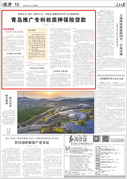 人民日報(bào)點(diǎn)贊青島:推廣專利權(quán)質(zhì)押保險(xiǎn)貸款 破解科技型中小企業(yè)融資難