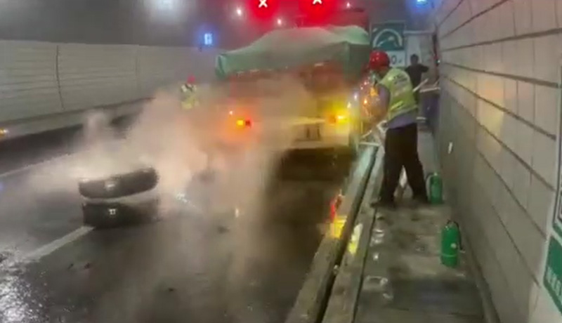 22點3分,巡查員通過對向隧道的汽通門第一時間進(jìn)入現(xiàn)場,施救人員從同向到達(dá)現(xiàn)場,一次“雙向奔赴”的救火就此展開。一名巡查員與施救人員緊密配合,拿出水槍,對著起火點進(jìn)行滅火。不出2分鐘,起火點的明火被熄滅,但是溫度還是很高,需要不斷澆水才能阻止輪胎復(fù)燃。另一名巡查員則將司機(jī)帶離到安全地帶,隨后又將車道上的雜物清理至緊急停車帶,以便解除卡口后為后續(xù)車輛提供一個安全的行車環(huán)境。22點23分,車道恢復(fù)暢通。