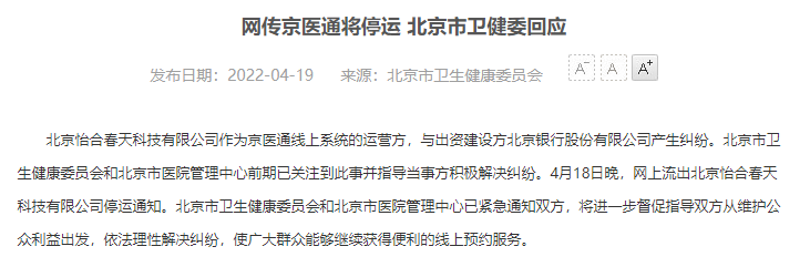 4月18日晚,網(wǎng)上流出北京怡合春天科技有限公司停運通知。北京市衛(wèi)生健康委員會和北京市醫(yī)院管理中心已緊急通知雙方,將進一步督促指導(dǎo)雙方從維護公眾利益出發(fā),依法理性解決糾紛,使廣大群眾能夠繼續(xù)獲得便利的線上預(yù)約服務(wù)。