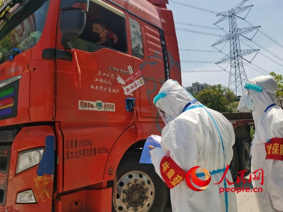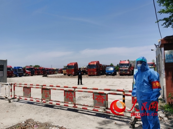 工作人員對(duì)外來(lái)貨車(chē)及駕乘人員進(jìn)行信息登記。人民網(wǎng)記者 王繼亮攝