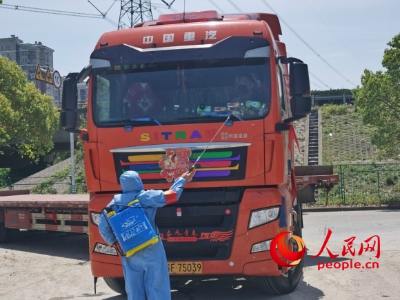 疫情防控人員對(duì)外來(lái)貨車(chē)進(jìn)行消殺。人民網(wǎng)記者 王繼亮攝