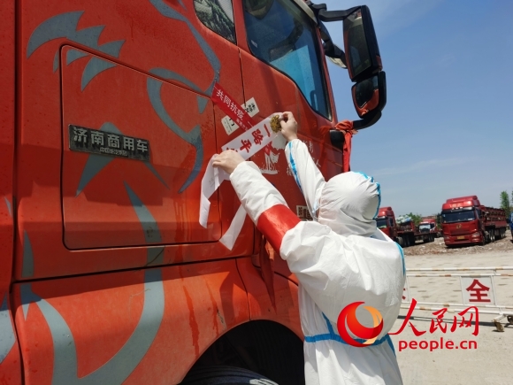 工作人員為外來(lái)貨車(chē)貼上封條。人民網(wǎng)記者 王繼亮攝