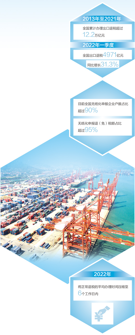 資金是企業(yè)的生命線。為助力外貿(mào)企業(yè)發(fā)展,財(cái)稅部門落實(shí)出口退稅政策,持續(xù)優(yōu)化出口退稅管理。2020年國家提高1464項(xiàng)產(chǎn)品的出口退稅率,稅務(wù)部門加強(qiáng)宣傳輔導(dǎo)、精準(zhǔn)推送,截至2021年底,共有9.4萬戶企業(yè)因這項(xiàng)政策受益,累計(jì)新增退稅377億元,進(jìn)一步增強(qiáng)了競爭力和抗壓力。2021年,國家稅務(wù)總局以出口退稅信息系統(tǒng)整合優(yōu)化為契機(jī),大幅簡并優(yōu)化退稅申報(bào)表單資料及辦稅流程,使出口退稅管理體系業(yè)務(wù)更全面、流程更優(yōu)化、權(quán)責(zé)更清晰、運(yùn)行更高效。