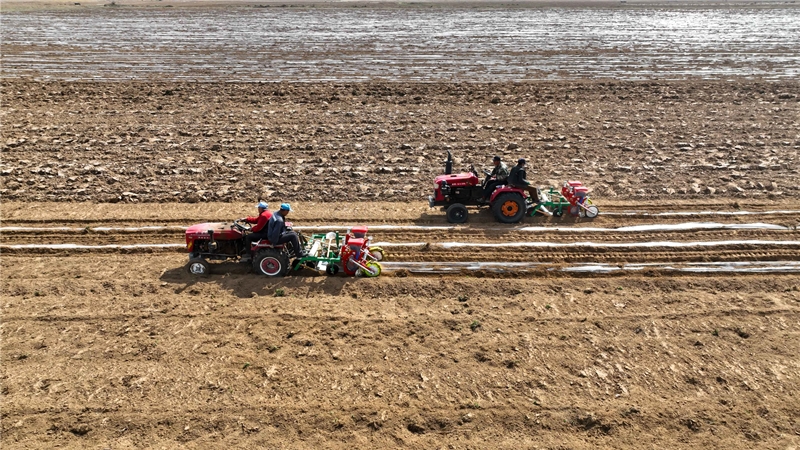 朔城區(qū)南榆林鄉(xiāng)青鐘村玉米核心區(qū)播種現(xiàn)場,應(yīng)用了膜側(cè)播種技術(shù)的播種機在田間播種作業(yè)。高文武 攝