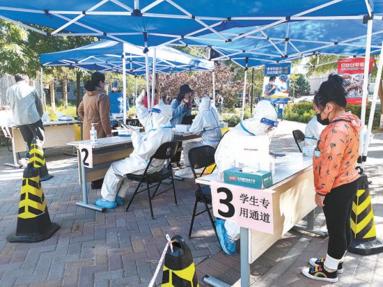昨天,石景山區(qū)古城街道燕堤中街社區(qū)核酸檢測(cè)點(diǎn)設(shè)有學(xué)生檢測(cè)專用通道,方便學(xué)生隨來隨檢,不耽誤上網(wǎng)課。本報(bào)記者 吳鏑攝