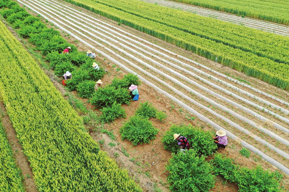 5月27日,新絳縣澤掌鎮(zhèn)吳嶺莊村,村民在采摘金銀花。連日來,當?shù)剞r民抓緊晴好天氣,加強對頭茬早熟玉米、辣椒、大蔥、中藥等進行田間管理。(高新生攝)