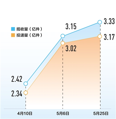 4月10日以來,各地各部門多措并舉保通保暢,全國(guó)停運(yùn)的郵政快遞分撥中心和郵件快件積壓數(shù)均大幅下降。5月6日,全國(guó)郵件快件攬收、投遞量均恢復(fù)至3億件以上;5月28日,郵件快件攬收量約為3.14億件,投遞量約為3.22億件,均超過去年同期水平。