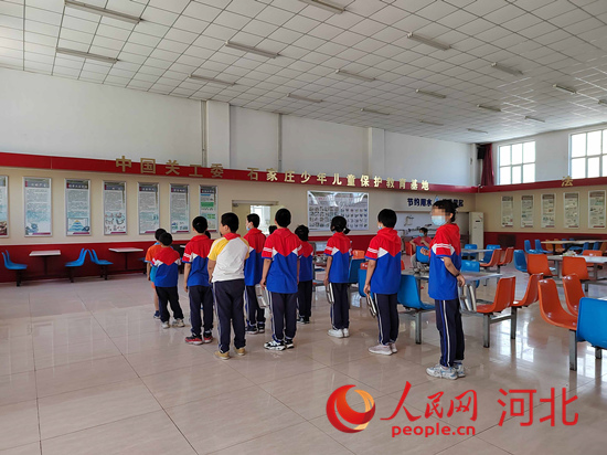 石家莊市少年兒童保護教育中心的孩子們在排隊吃午飯。 人民網(wǎng) 祝龍超攝